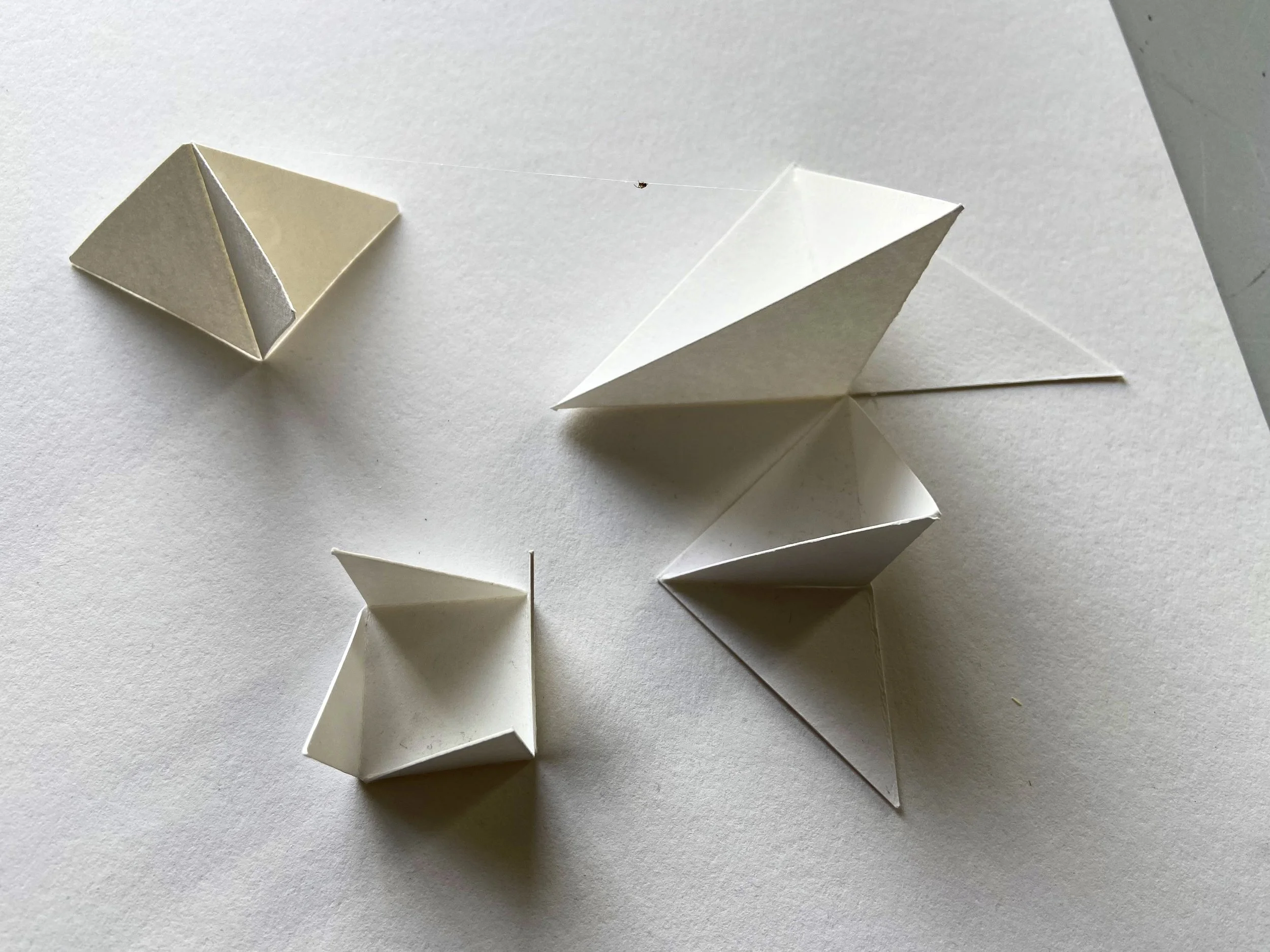 I make things with paper — books, book cradles, mountings for photographs, even shelves. Some or part of these things are ultimately made of museum board or foam core but they nearly always start out as forms I work out with small pieces of paper. Beyond the use of a thing sometimes the shape itself interests me. If I see a shape I like in a book or online I’ll make it and sit it on my work surface to look at. I once set two small paper shapes on a square of paper and left them for so long that a spider spun a thread between them ⇢